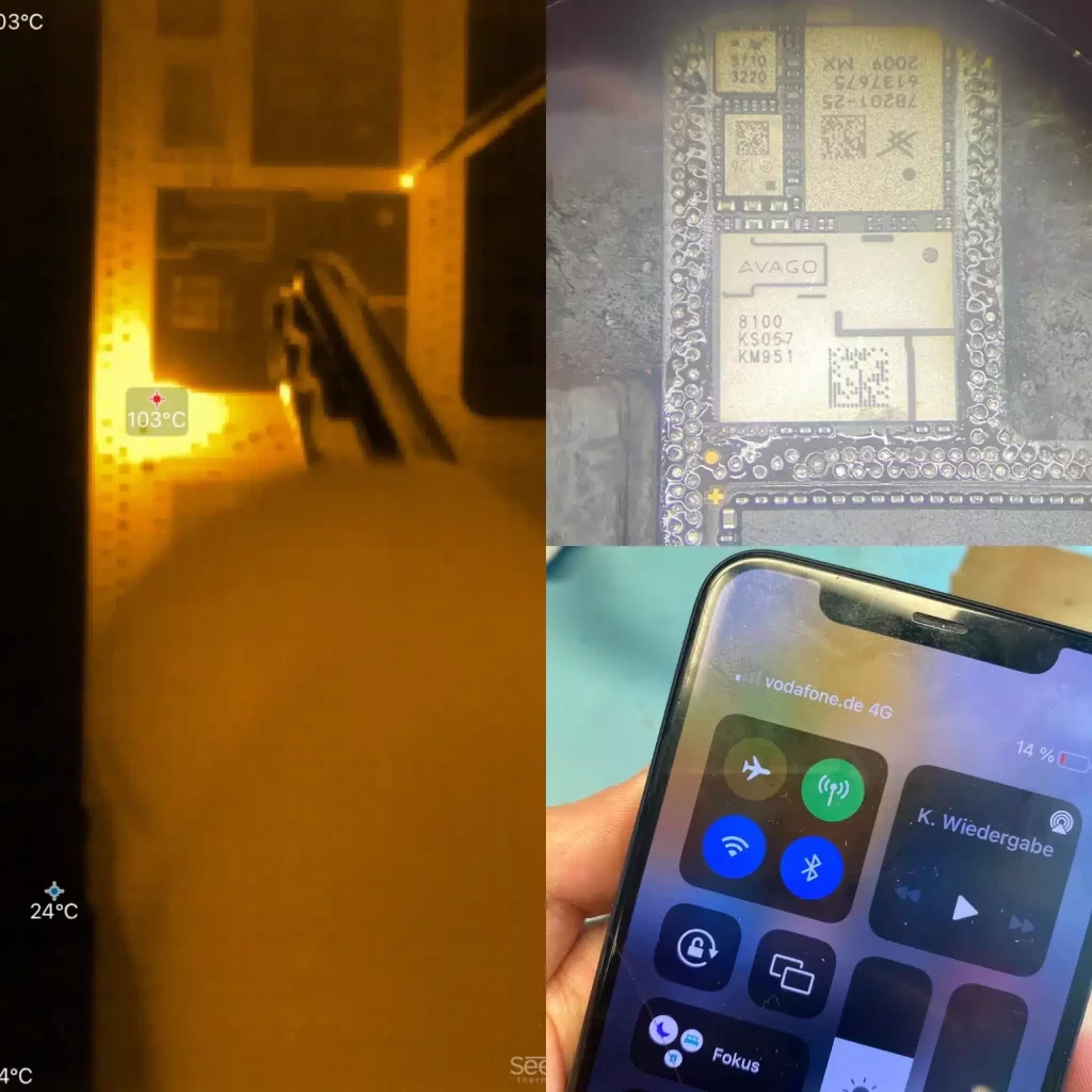 Nach vielen klassischen Fehlern am iPhone hat auch das iPhone 11 ein typisches Problem. Durch einen Kurzschluss auf dem Mainboard, hier sichtbar gemacht durch eine Wärmebildkamera funktioniert der RF IC nicht und kann die Signale nicht verarbeiten. Durch das ersetzen des ICs konnte auch dieses iPhone repariert werden.